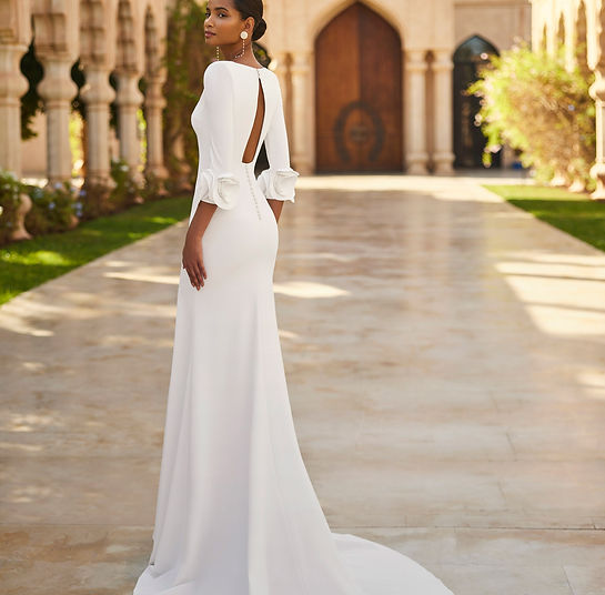✨NEW !!!!✨ Robe de mariée longue, deux pièces, coupe sirène. En crêpe bi-extensible avec un décolleté carré, manches trois-quarts, dos ouvert, surjupe et ceinture amovible en mikado.